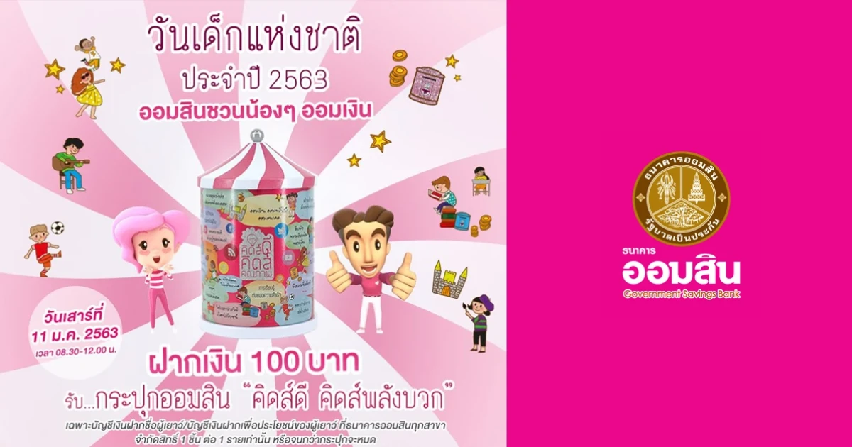 ธนาคารออมสิน จัดงานวันเด็ก 2563 เด็กฝากเงินด้วยตัวเอง 100 บาท รับ "กระปุกคิดส์ดี คิดส์พลังบวก"