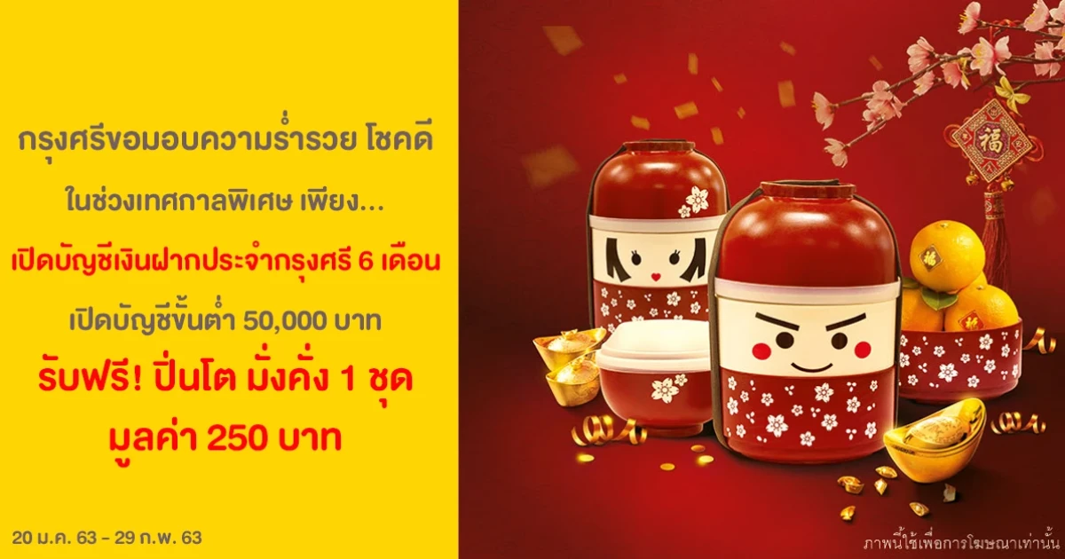 กรุงศรีขอมอบความร่ำรวย โชคดี ในช่วงเทศกาลพิเศษ เพียงเปิด บัญชีเงินฝากประจำกรุงศรี 6 เดือน เปิดบัญชีขั้นต่ำ 50,000 บาท รับฟรี! ปิ่นโต มั่งคั่ง 1 ชุด มูลค่า 250 บาท