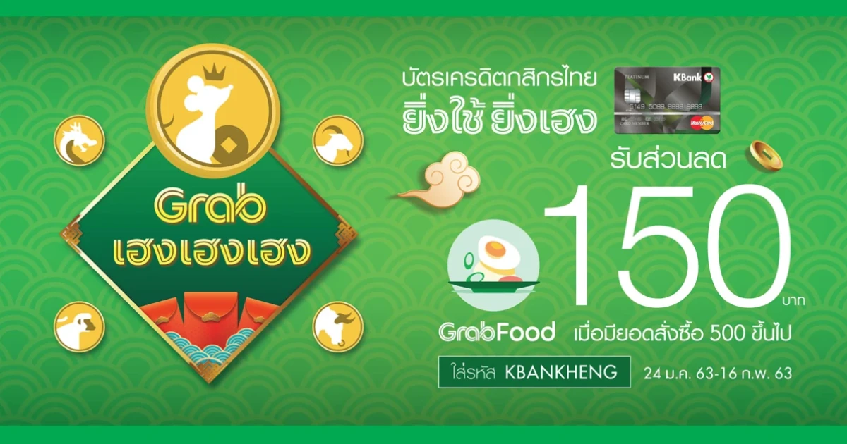 บัตรเครดิตกสิกรไทย ยิ่งใช้ยิ่งเฮง รับส่วนลด GrabFood 150 บาท เมื่อมียอดสั่งซื้อ 500 บาทขึ้นไป โดยใส่รหัส KBANKHENG