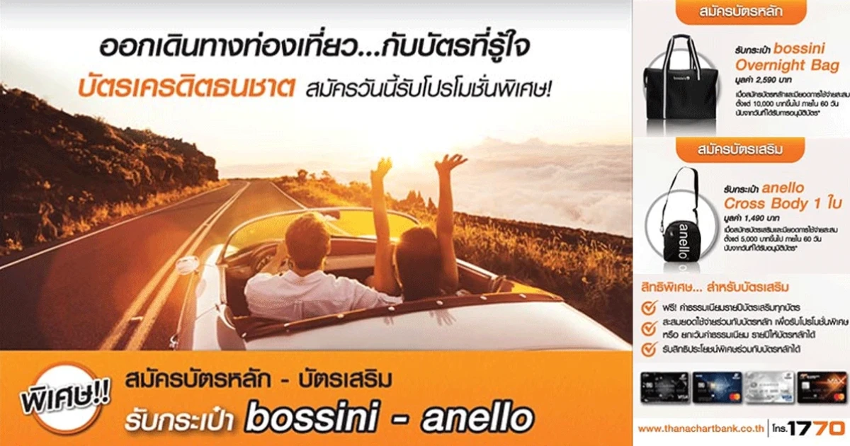สมัครบัตรเครดิตธนชาต วันนี้ รับโปรโมชั่นพิเศษ! สำหรับผู้สมัครบัตรเครดิตรายใหม่ที่สมัครบัตรหลัก - บัตรเสริม รับกระเป๋า bossini - anello เมื่อใช้จ่ายตามเงื่อนไขที่ธนาคารกำหนด