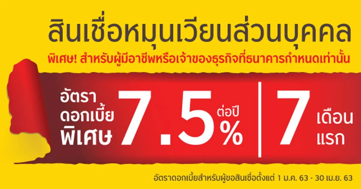- อัตราดอกเบี้ย 7.5% ต่อปี 7 เดือนแรก เฉพาะผู้มีอาชีพ หมอ, วิศวกร, ทนายความ, ตุลาการ, อัยการ, นักบิน หรือเจ้าของธุรกิจประเภทขายปลีกร้านขายยา และอุปกรณ์การแพทย์/สุขภาพ, บริการชิปปิ้ง, บริการส่งพัสดุภัณฑ์, บริการขนส่ง, บริษัทที่ปรึกษา/ที่ปรึกษาอิสระ, โรงพยาบาล/สถานพยาบาล/แพทย์/ทันตแพทย์/เภสัชกร, สถานพยาบาลรักษาสัตว์/สัตวแพทย์, สำนักงานทนายความ/ผู้ตรวจสอบ, สถาปนิก/วิศวกร/ตกแต่งภายใน, ขายส่ง-วัสดุก่อสร้าง, การก่อสร้าง โดยได้รับวงเงินอนุมัติตั้งแต่ 300,000 บาทขึ้นไป และรับเงินกู้โดยวิธีโอนเงินเข้าบัญชีเงินฝากธนาคารเท่านั้น อัตราดอกเบี้ยนี้มีผลตั้งแต่วันที่ 1 ม.ค. 63 - 30 เม.ย. 63