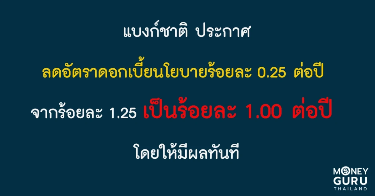 แบงก์ชาติประกาศลดอัตราดอกเบี้ยนโยบายจากร้อยละ 1.25 เป็นร้อยละ 1.00 ต่อปี โดยให้มีผลทันที