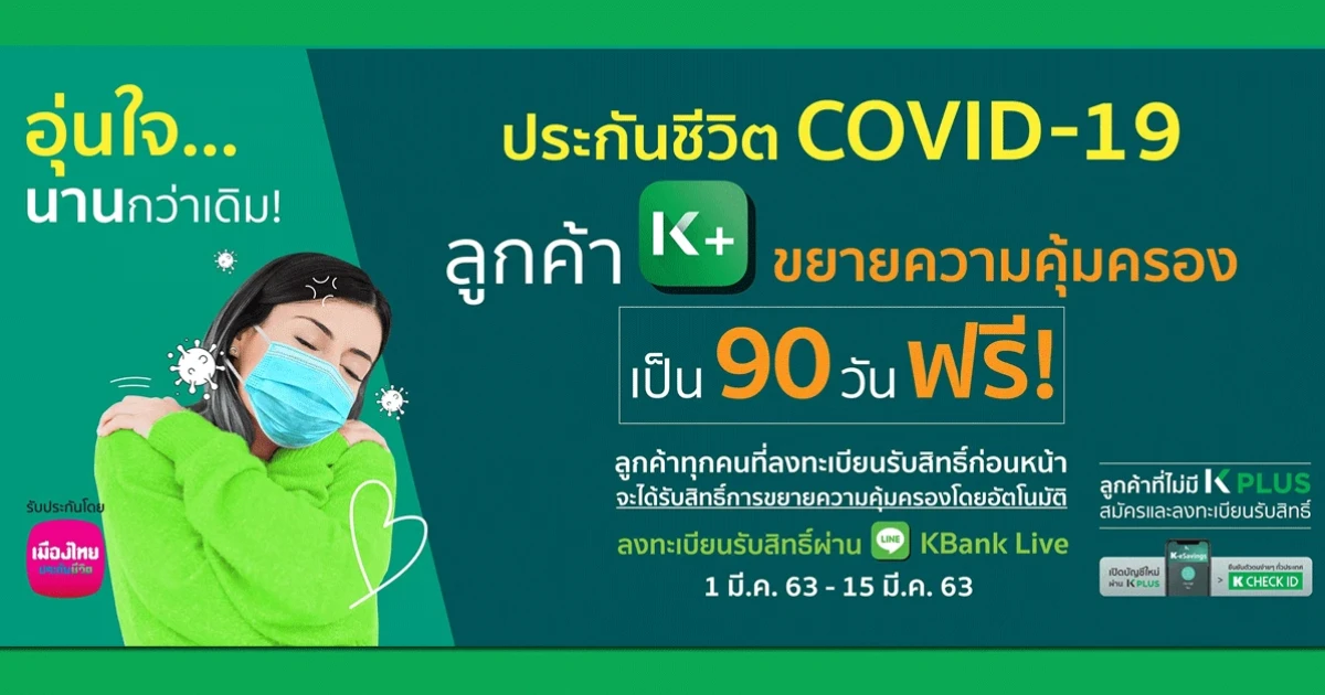 ลูกค้า KPLUS ขยายความคุ้มครองจากเดิม 30 วัน เป็น 90 วัน ฟรี!! ความคุ้มครองระดับพรีเมียม! ประกันชีวิต COVID-19 เพียงลงทะเบียนรับสิทธิ์ผ่าน Line KBank Live ภายในวันที่ 29 ก.พ. - 15 มี.ค. 63