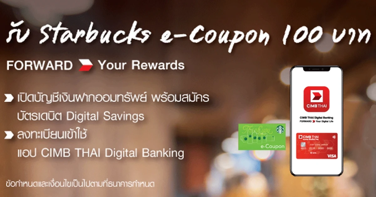 - ผู้ใช้บริการที่เข้าตามเงื่อนไขรายการส่งเสริมการขาย จะได้รับ Starbucks e-Coupon มูลค่า 100 บาท ผ่านทางข้อความ SMS ไปยังหมายเลขโทรศัพท์ที่ผู้ใช้บริการได้ให้ไว้เท่านั้น ภายใน 30 วันทำการ หลังลงทะเบียนเข้าใช้แอปฯ CIMB THAI Digital Banking โดยสามารถนำไปใช้ได้กับการซื้อสินค้า อาหารและเครื่องดื่ม ที่ร้าน Starbucks ทุกสาขาทั่วประเทศ