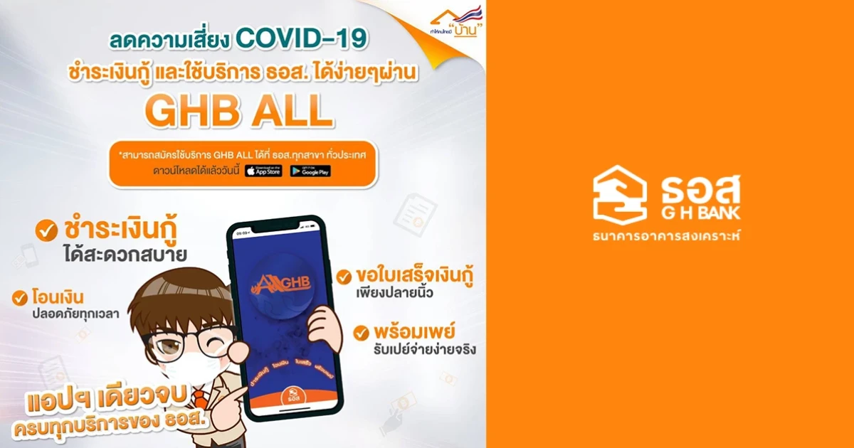 ธนาคารอาคารสงเคราะห์ (ธอส.) ห่วงใยและใส่ใจในสุขภาพของลูกค้าธนาคาร แนะนำวิธีการลดความเสี่ยงจากการเดินทางไปในพื้นที่สาธารณะ และสถานที่แออัด เพื่อความปลอดภัยไร้กังวลกับการใกล้ชิดกับผู้อื่น และสถานการณ์ไวรัสโคโรนา (Covid-19) สามารถทำธุรกรรมกับ ธอส.ด้วย Mobile Application : GHB ALL แอปฯ เดียวครบจบ รวมทุกบริการ ธอส.ไว้ในมือคุณ อาทิ ชำระเงินกู้ ดูใบเสร็จ บริการโอนเงินภายใน และต่างธนาคาร บริการ PromptPay ดู statement ชำระค่าสินค้าและบริการ ดูรายการทรัพย์ NPA และค้นหาที่ตั้งสาขา เป็นต้น