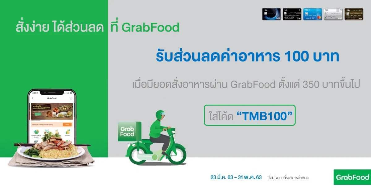 สิทธิพิเศษสำหรับ ลูกค้า บัตรเครดิตทีเอ็มบี สั่งง่าย ได้ส่วนลด ที่ GrabFood รับส่วนลดค่าอาหาร 100 บาท เมื่อมียอดสั่งอาหารผ่าน GrabFood ตั้งแต่ 350 บาท ขึ้นไป และเลือกชำระผ่านบัตรฯ