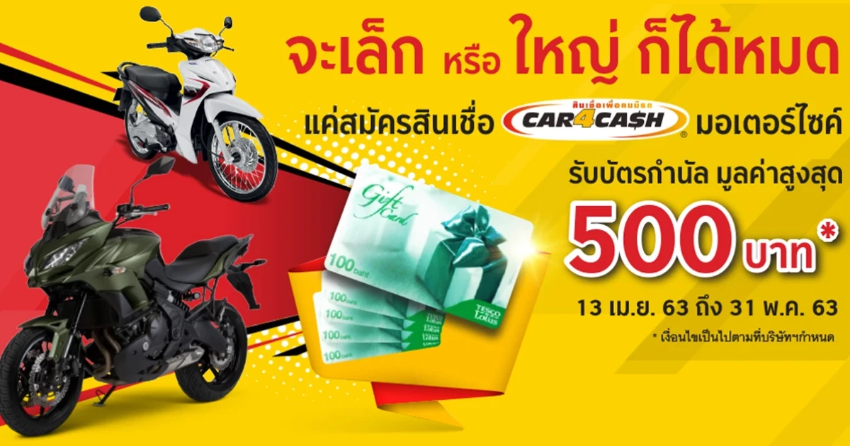 พิเศษ! รับบัตรกำนัล เทสโก้ โลตัส สูงสุด 500 บ. สำหรับลูกค้าที่สมัครสินเชื่อ คาร์ ฟอร์ แคช มอเตอร์ไซค์