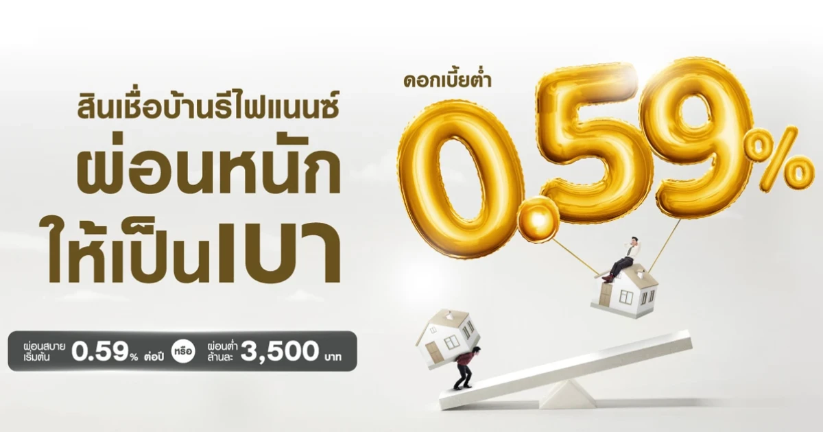สินเชื่อบ้านรีไฟแนนซ์ ดอกเบี้ยต่ำโดนใจ ผ่อนสบายๆ นานสูงสุด 35 ปี ดอกเบี้ยต่ำเริ่มต้น 0.59% ต่อปี