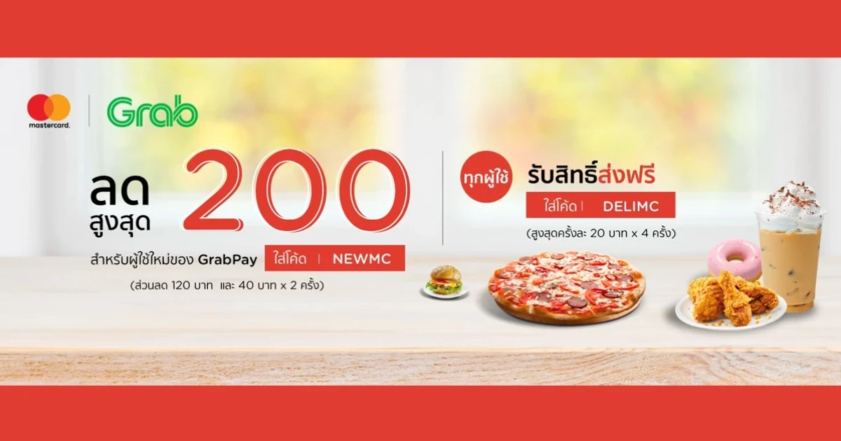 โปรโมชั่นบัตรเครดิต KTC MASTERCARD ที่ GrabFood รับส่วนลดสูงสุด 200 บาท สำหรับผู้ใช้ใหม่ของ GrabPay เมื่อชำระเงินผ่านบัตรเครดิต KTC MASTERCARD ทุกประเภท