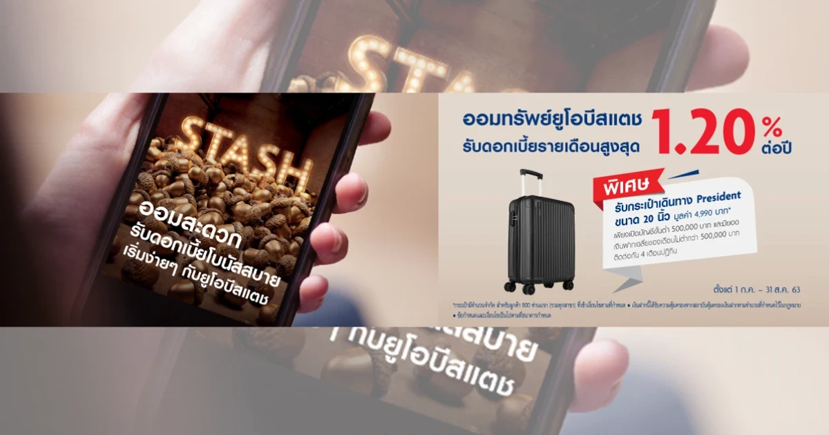 บัญชีเงินฝากออมทรัพย์ยูโอบีสแตช (UOB STASH) ทางเลือกใหม่สำหรับการออมเงินกับบัญชีออมทรัพย์แบบไม่มีสมุดคู่ฝาก พิเศษ! ออมวันนี้...รับกระเป๋าเดินทาง President ขนาด 20 นิ้ว มูลค่า 4,990 บาท เพียงเปิดบัญชีขั้นต่ำ 500,000 บาท และมียอดเงินฝากเฉลี่ยของเดือนไม่น้อยกว่า 500,000 บาท ติดต่อกัน 4 เดือนปฏิทิน