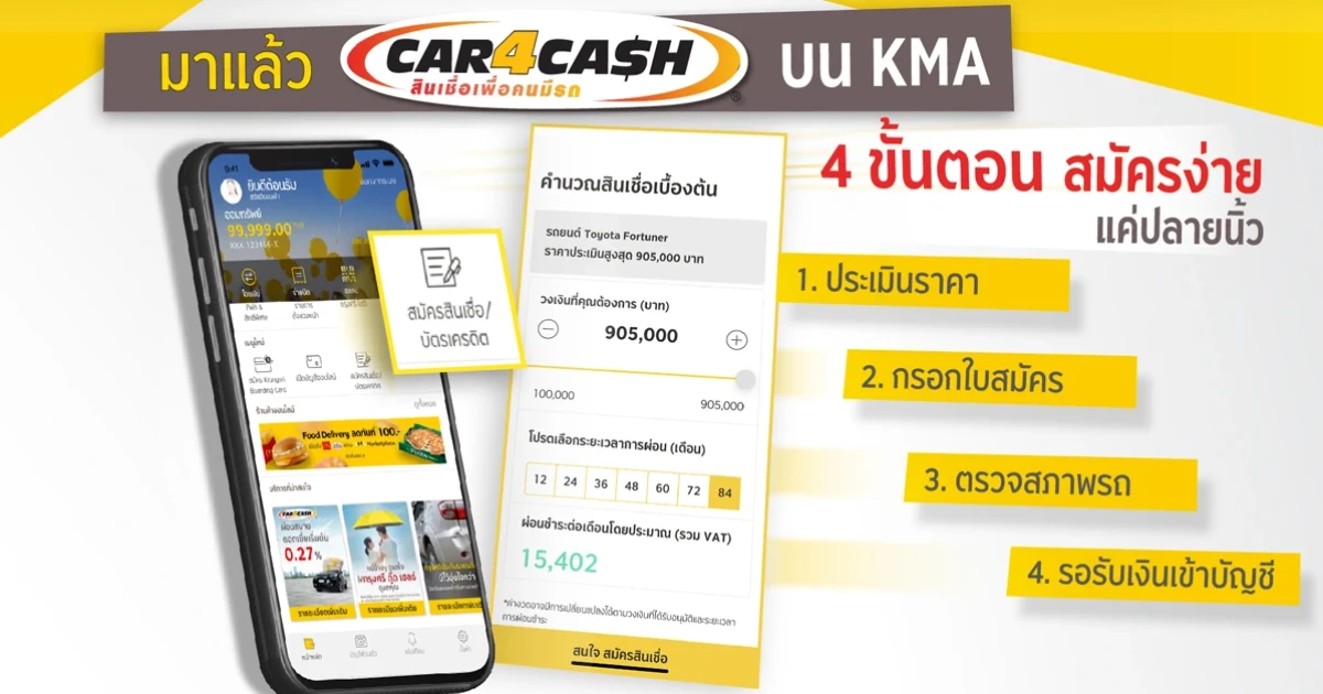 คาร์ ฟอร์ แคช บนแอป KMA ขอสินเชื่อเพื่อคนมีรถง่ายๆ แค่ปลายนิ้ว ให้ชีวิตก้าวต่อ ไม่มีสะดุด