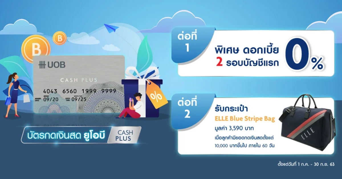 - โปรโมชั่นนี้ระหว่างวันที่ 1 ก.ค. 63 - 30 ก.ย. 63 สำหรับผู้สมัครวงเงินยูโอบี แคชพลัส และใบสมัครได้รับการอนุมัติจากธนาคาร ภายในวันที่ 16 ต.ค. 63