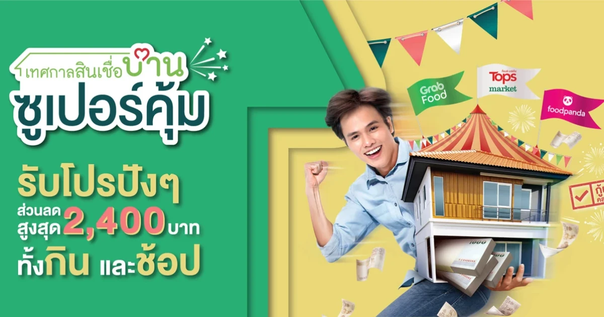 เทศกาลสินเชื่อบ้านซูเปอร์คุ้ม คุ้มทุกหลัง ทั้งสินเชื่อบ้านช่วยได้ รีไฟแนนซ์ และสินเชื่อบ้าน รับโปรกินช้อปสูงสุด 2,400 บาท