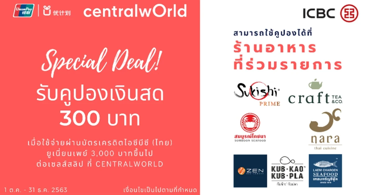 - รับคูปองเงินสด 300 บาท เมื่อใช้จ่ายผ่านบัตรเครดิตไอซีบีซี (ไทย) ยูเนี่ยนเพย์ 3,000 บาทขึ้นไป ณ ร้านค้าที่รับบัตรยูเนี่ยนเพย์ในเซ็นทรัลเวิลด์
