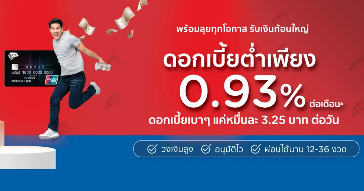 KTC PROUD สมัครวันนี้...รับเงินกู้ดอกเบี้ยต่ำ ดอกเบี้ยเบาสุดๆ เพียง 0.93% ต่อเดือน หรือแค่หมื่นละ 3.25 บาทต่อวัน