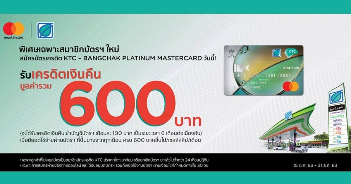 สมัครบัตรเครดิต KTC - BANGCHAK PLATINUM MASTERCARD วันนี้! รับเครดิตเงินคืนรวม 600 บาท*