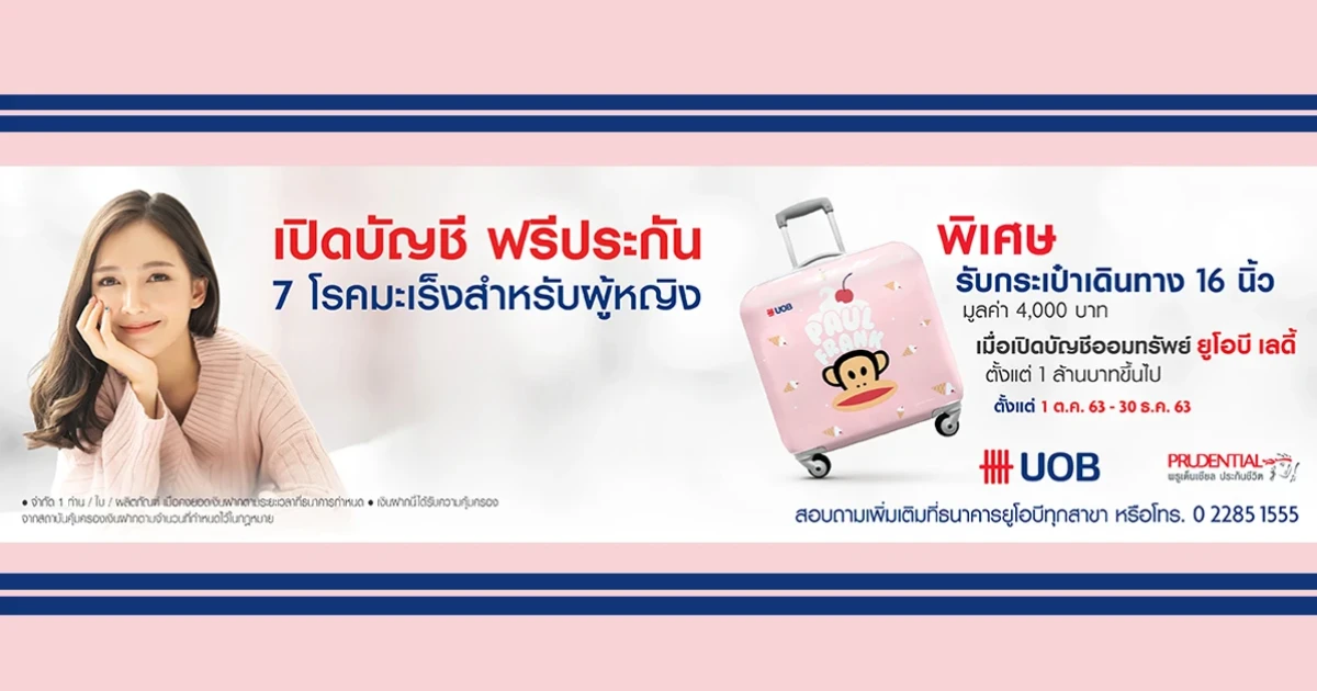 เปิดบัญชี ฟรีประกัน 7 โรคมะเร็งสำหรับผู้หญิง เพียงเปิด บัญชีเงินฝาก UOB Lady's savings ตั้งแต่ 1 ล้านบาทเป็นต้นไป/บัญชี ณ วันเปิดบัญชี ติดต่อกันตามระยะเวลาที่กำหนด จะได้รับ Paul Frank Trolley Bag 16 นิ้ว จำนวน 1 ชิ้น มูลค่า 4,000 บาท