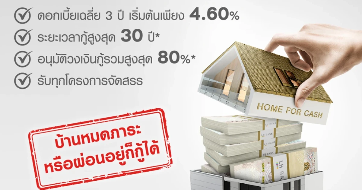 บ้านหมดภาระ หรือผ่อนอยู่ก็กู้ได้ เปลี่ยนบ้านเป็นเงินก้อน ดอกเบี้ยเริ่มต้นเพียง 4.60% ต่อปี
