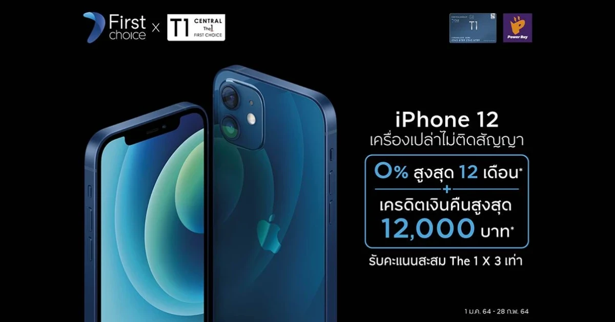 ผ่อน iPhone 12 ทุกรุ่น ทุกความจุ เครื่องเปล่าไม่ติดสัญญา 0% นาน 12 เดือน พร้อมรับเครดิตเงินคืนสูง กับบัตรเซ็นทรัล เดอะวัน เฟิร์สช้อยส์