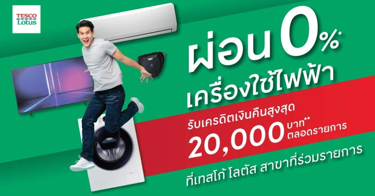 - ผ่อนเครื่องใช้ไฟฟ้า 0%* นานสูงสุด 12 เดือน เฉพาะสินค้าที่ร่วมรายการ หรือ
