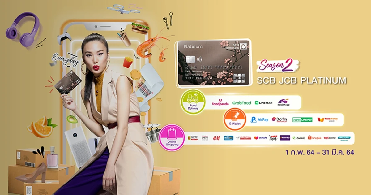 - สิทธิพิเศษเฉพาะผู้ถือบัตรเครดิตธนาคารไทยพาณิชย์ SCB JCB PLATINUM ("ผู้ถือบัตร") ที่มียอดชำระค่าสินค้า / บริการผ่านบัตรเครดิตธนาคารไทยพาณิชย์ SCB JCB PLATINUM (?บัตรเครดิต?) แบบเต็มจำนวน ณ หมวดร้านค้าออนไลน์ที่ร่วมรายการในประเทศไทย ในระบบของ JCB สำหรับรายการส่งเสริมการขายนี้เท่านั้น ได้แก่ หมวดบริการส่งอาหาร (Food Delivery) อาทิ foodpanda, GrabFood, LINE MAN, Robinhood, หมวดกระเป๋าเงินอิเล็กทรอนิกส์ (E-Wallet) อาทิ AirPay, Dolfin, Rabbit LINE Pay, Truemoney Wallet และหมวดซื้อสินค้าออนไลน์ (Online Shopping) อาทิ Big C Online, Central Online, H&M, Home Pro Online, JD Central, Lazada, Makro Click, Power Buy, Robinson, Shopee, Tops Online, Watson