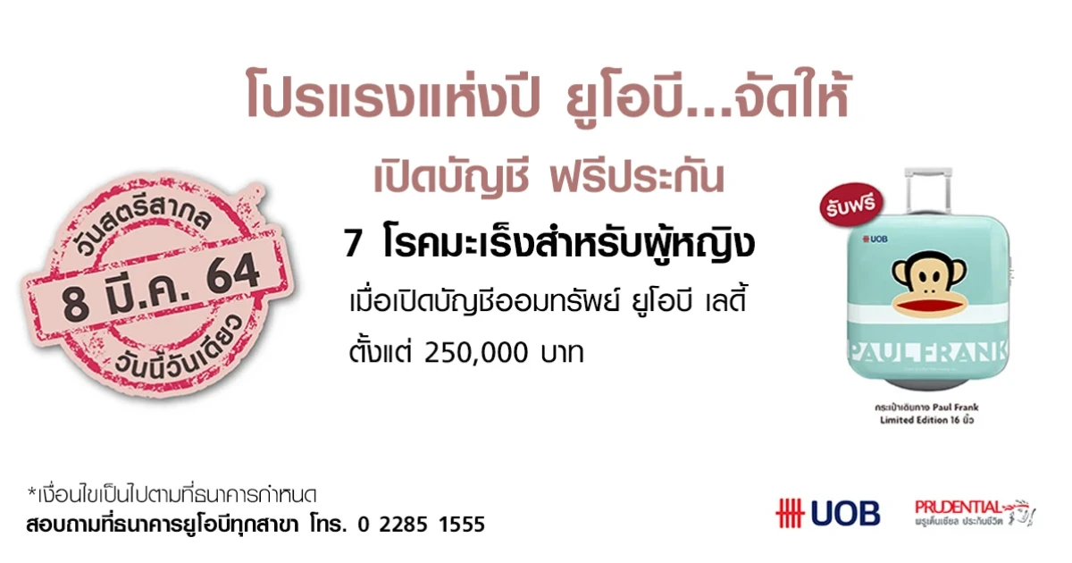 วันสตรีสากล 8 มีนาคม 2564...เปิดบัญชีเงินฝาก UOB Lady's savings ตั้งแต่ 250,000 บาทเป็นต้นไป รับ Paul Frank Trolley Bag 16 นิ้ว จำนวน 1 ชิ้น มูลค่า 4,000 บาท* ซึ่งมูลค่าของกำนัลเทียบเท่าดอกเบี้ยเงินฝากที่เพิ่มขึ้นร้อยละ 1.60 ต่อปี คำนวณจากมูลค่าของกำนัล 4,000 บาท สำหรับยอดเงินฝาก 250,000 บาทตลอดระยะเวลา 1 ปี