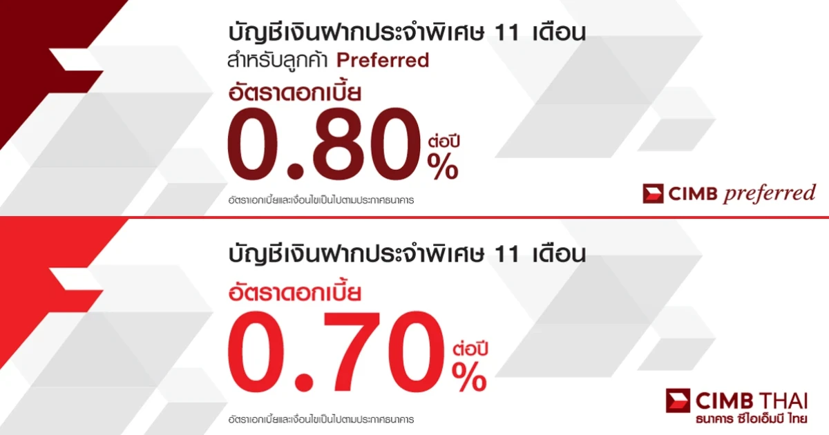 บัญชีเงินฝากประจำพิเศษ 7, 11 เดือน CIMB Preferred and CIMB Thai Private Banking สำหรับลูกค้า CIMB Preferred หรือ CIMB Thai Private Banking ประเภทลูกค้าบุคคลธรรมดาเท่านั้น หรือสมัครเป็นลูกค้า CIMB Preferred หรือ CIMB Thai Private Banking ในวันและเวลาเดียวกันกับการขอเปิดบัญชี