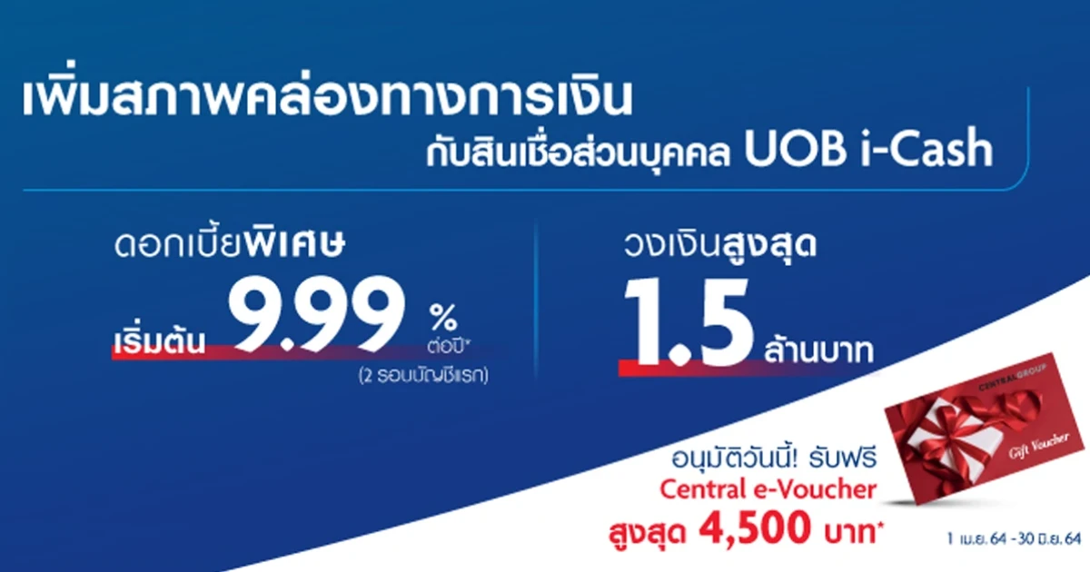 สมัครสินเชื่อส่วนบุคคล UOB i-Cash อนุมัติวันนี้ รับฟรี! Central e-Voucher สูงสุด 4,500 บาท