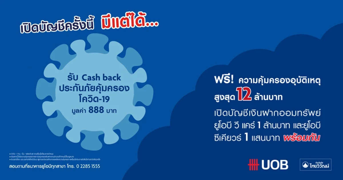 โปรโมชั่นเปิดบัญชีครั้งนี้มีแต่ได้ เพียงเปิด บัญชีเงินฝากออมทรัพย์ยูโอบี วีแคร์ (UOB Vcare) และ บัญชีเงินฝากออมทรัพย์ยูโอบี ซีเคียวร์ ตั้งแต่ 1 แสนบาท พร้อมกัน และคงยอดเงินฝากทั้ง 2 บัญชีตามระยะเวลาที่กำหนด ลูกค้าจะได้รับความคุ้มครองจากประกันภัยคุ้มครองโควิด-19 มูลค่า 888 บาท หรือ