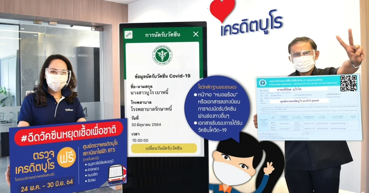 เครดิตบูโร ร่วมสนับสนุนคนไทย ตรวจเครดิตบูโร...ฟรี!!! เพียงโชว์การจองคิววัคซีนหรือเอกสารรับรองได้รับวัคซีนโควิด-19 ได้ที่ศูนย์ตรวจเครดิตบูโรบนสถานี BTS ทุกแห่ง
