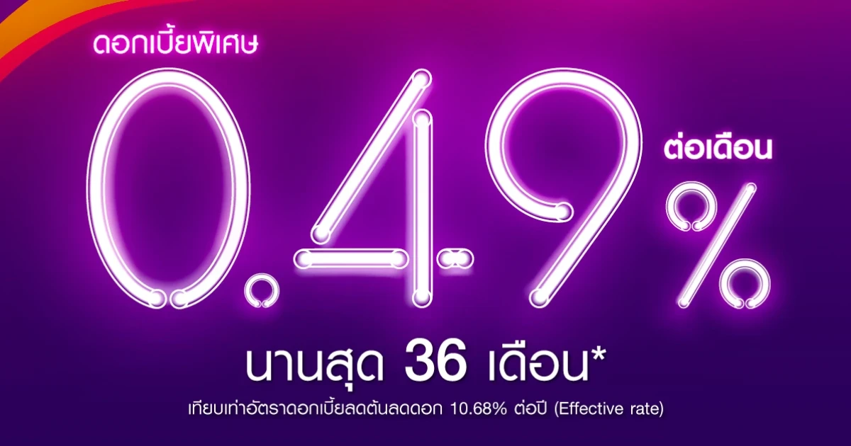 - จำนวนงวดการผ่อนชำระเริ่มต้น 3 เดือน ผ่อนนานสูงสุด 36 เดือน ระยะเวลาการผ่อนอาจแตกต่างขึ้นกับการพิจารณาและเงื่อนไขของธนาคาร