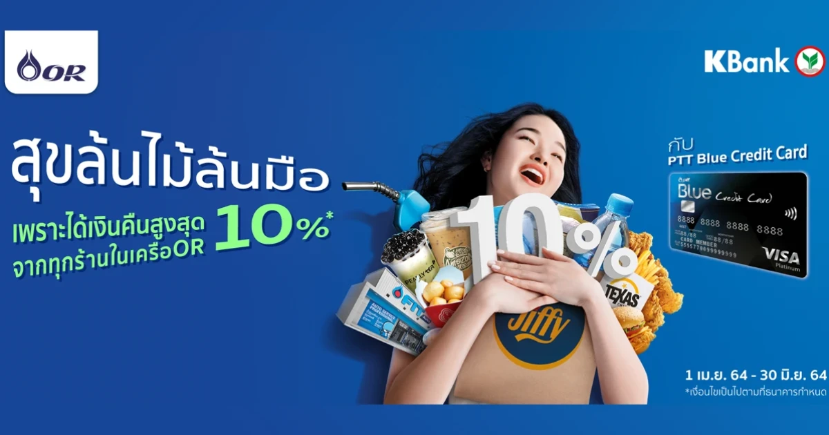 สิทธิพิเศษ! เฉพาะสมาชิกบัตรพีทีทีบลูเครดิตการ์ด (PTT Blue Credit Card) รับเครดิตเงินคืนสูงสุด 10%* เมื่อสะสมยอดใช้จ่ายที่ร้านค้าในเครือ OR ตามที่กำหนด