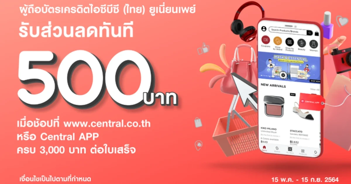สิทธิพิเศษเฉพาะผู้ถือ บัตรเครดิตไอซีบีซี (ไทย) ยูเนี่ยนเพย์ รับส่วนลดทันที 500* บาท เมื่อช้อปที่เซ็นทรัล ออนไลน์ www.central.co.th หรือ Central APP ครบ 3,000 บาทต่อใบเสร็จ