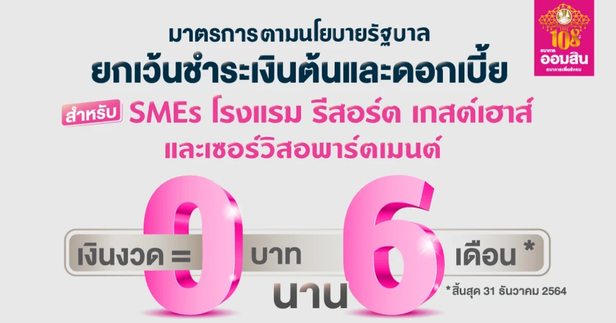 ออมสิน รับมอบนโยบายรัฐบาล พักหนี้ให้ SMEs ท่องเที่ยวทั้งเงินต้นและดอกเบี้ย นาน 6 เดือน โรงแรม-รีสอร์ต-เกสต์เฮาส์-เซอร์วิสอพาร์ตเมนท์ แจ้งเข้าร่วมมาตรการได้ถึง 23 ก.ค. นี้