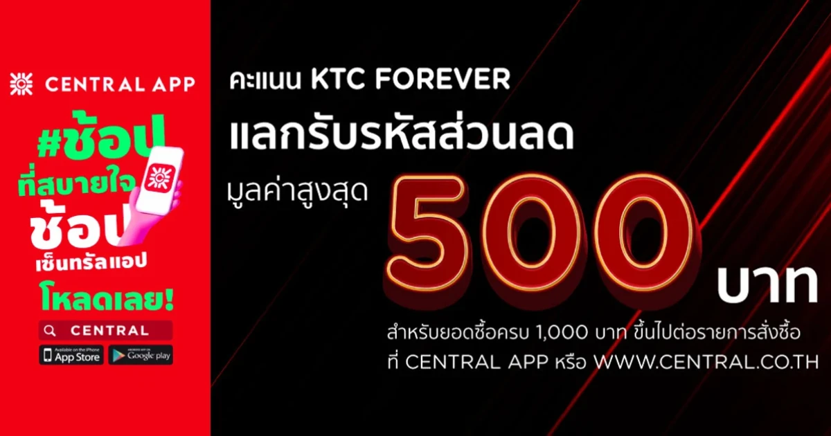 สิทธิพิเศษสำหรับสมาชิก บัตรเครดิต KTC ใช้คะแนน KTC FOREVER แลกรับ e-Coupon รหัสส่วนลดสูงสุด 500 บาท ต่อรายการสั่งซื้อที่ Central Application หรือ www.central.co.th