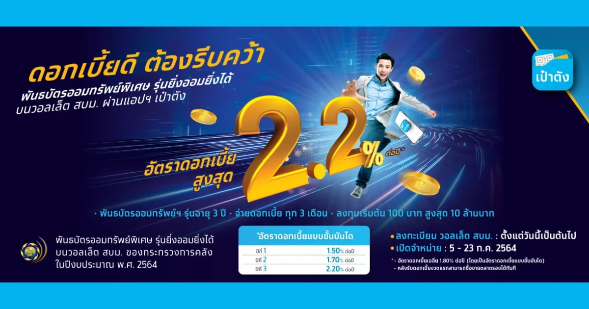 ดอกเบี้ยดี ต้องรีบคว้า พันธบัตรออมทรัพย์รุ่นยิ่งออมยิ่งได้ บนวอลเล็ต สบม. ของกระทรวงการคลังในปีงบประมาณ พ.ศ. 2564 (พันธบัตรแบบไร้ใบตราสาร ไม่มีการออกใบพันธบัตรตลอดอายุพันธบัตร)