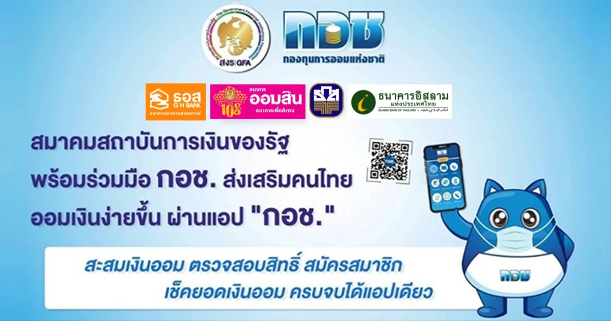 สมาคมสถาบันการเงินของรัฐ จับมือ กองทุนการออมแห่งชาติ ร่วมส่งเสริมให้คนไทยได้มีเงินออมใช้หลังอายุ 60 ปี พร้อมยกระดับคุณภาพชีวิตประชาชนคนไทยให้ดีขึ้นผ่านการออมกับ กอช. สมัครสมาชิกและส่งเงินออมสะสมขั้นต่ำ 50 บาท สูงสุด 13,200 บาท/ปี และรับเงินสมทบจากรัฐบาล 100% ไม่เกิน 1,200 บาท/ปี เพียงตรวจสอบสิทธิ์ก่อนการสมัครได้ที่แอปพลิเคชัน (Application) "กอช" หรือ www.nsf.or.th