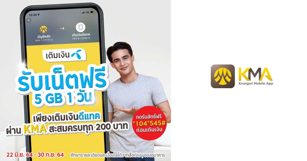 เติมเงินดีแทค ผ่าน KMA สะสมครบทุก 200 บาท รับเน็ตฟรี 5 GB 1 วัน