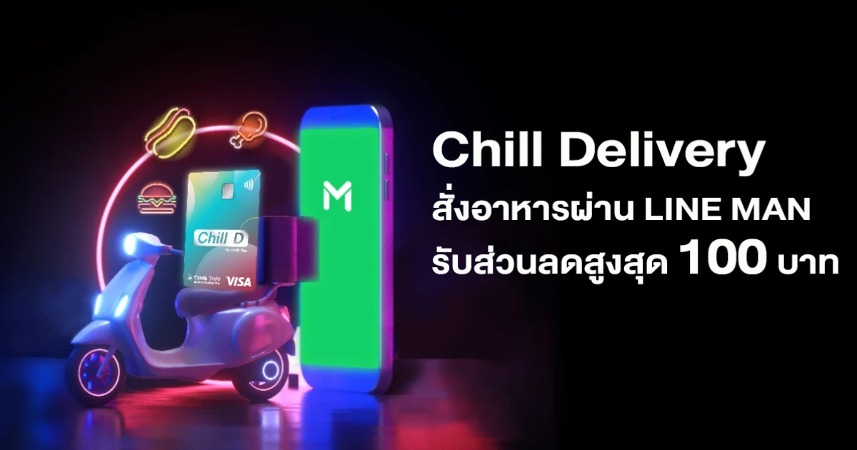 Chill Delivery สั่งอาหารผ่าน LINE MAN รับส่วนลดสูงสุด 100 บาท เมื่อชำระค่าอาหาร ผ่านบัตรเดบิต ชิลดี