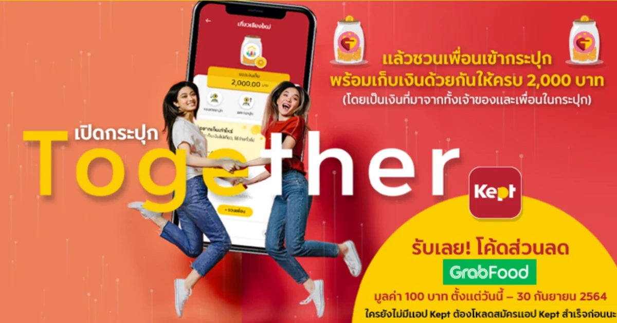 ลูกค้าแอป Kept เพียงเปิดกระปุก Together และเชิญเพื่อนอย่างน้อย 1 คน เข้าเป็นสมาชิกในกระปุก Together และมียอดเงินโอนรวมอย่างน้อย 2,000 บาท จากเจ้าของกระปุกและสมาชิกอย่างน้อย 1 คน เข้ากระปุก Together ระหว่างวันที่ 15 กรกฎาคม - 30 กันยายน 2564 ทั้งนี้ เจ้าของกระปุกจะต้องทำการลงทะเบียนยืนยันอีเมล (Verified e-mail) ภายในวันที่ 15 ตุลาคม 2564 เพื่อรับโค้ดส่วนลด GrabFood มูลค่า 100 บาท ผ่านทางอีเมลตามเงื่อนไขที่กำหนด