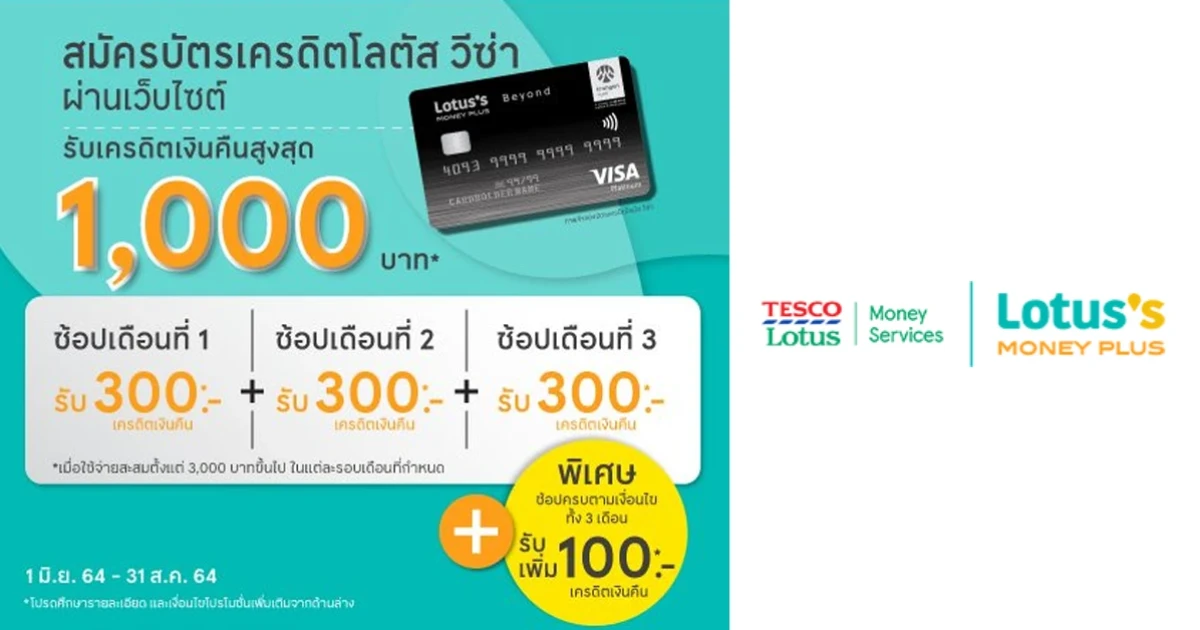 - เฉพาะสมาชิกใหม่ที่ไม่เคยถือบัตรเครดิตโลตัส วีซ่า หรือยกเลิกบัตรไปแล้วไม่ต่ำกว่า 6 เดือน และสมัครบัตรผ่าน Website ในระหว่าง 1 มิ.ย. 64 - 31 ส.ค. 64 และได้รับอนุมัติภายในวันที่ 15 ก.ย. 64 และมียอดใช้จ่ายตามเงื่อนไข