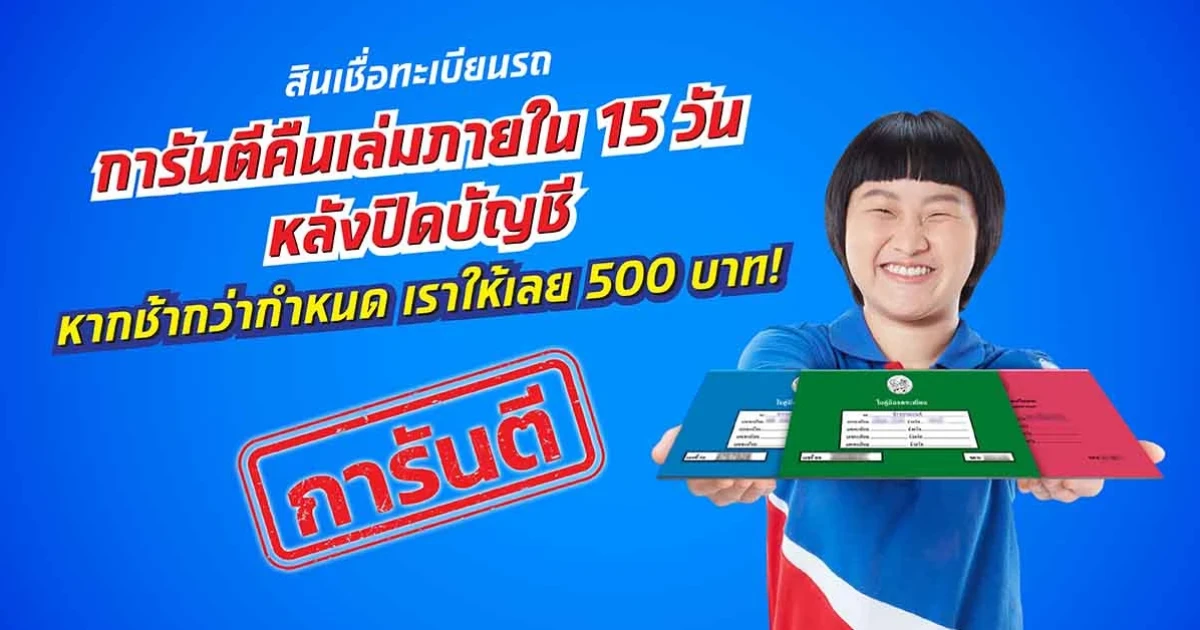 สินเชื่อทะเบียนรถ การันตีคืนเล่มภายใน 15 วันหลังปิดบัญชี หากล่าช้า รับเลย 500 บาท