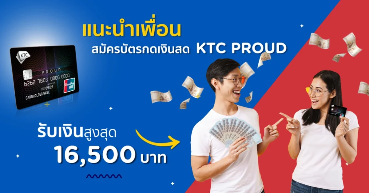 KTC PROUD ชวนแนะนำเพื่อน ผู้แนะนำรับสูงสุด 16,500 บาท วันนี้ - 31 ธ.ค. 64