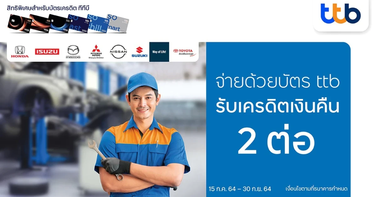 บัตรเครดิตทีทีบี มอบสิทธิพิเศษสุดคุ้มที่ศูนย์บริการรถยนต์ชั้นนำ รับเครดิตเงินคืนถึง 2 ต่อ