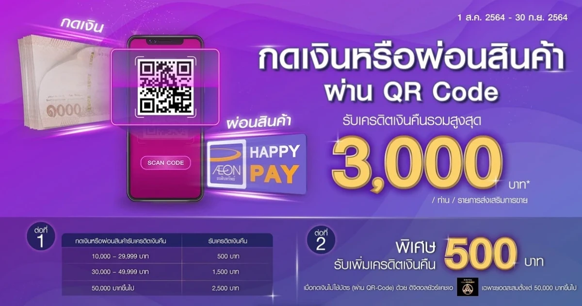 หมายเหตุ : วงเงินเบิกถอนเงินสดเป็นไปตามวงเงินที่ได้รับอนุมัติจากบริษัทฯ ยอดที่ผู้ถือบัตรสามารถเบิกถอนเงินสดได้ ขึ้นอยู่กับวงเงินคงเหลือในบัญชี โดยวงเงินสำหรับเบิกถอนเงินสดอาจมีการเปลี่ยนแปลงขึ้นอยู่กับประวัติการชำระเงิน) - บริษัทฯ สงวนสิทธิ์การให้เครดิตเงืนคืน เฉพาะลูกค้าที่ทำรายการ เบิกถอนเงินสด และ/หรือผ่อนชำระสินค้า โดยไม่ใช้บัตร(ผ่านการสแกน QR CODE) เท่านั้น ลูกค้าที่ทำรายการโดยใช้บัตร ไม่สามารถรวมยอดกับการใช้บริการเบิกถอนเงินสด และ/หรือผ่อนชำระสินค้า (AEON Happy Pay) ผ่านรายการส่งเสริมการขายนี้ได้