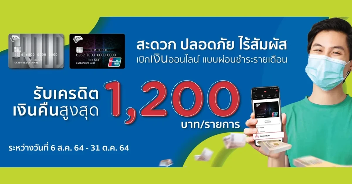 - รายการส่งเสริมการขาย ("รายการ") นี้ บริษัท บัตรกรุงไทย จำกัด (มหาชน) หรือ เคทีซีจัดทำขึ้นเพื่อมอบสิทธิประโยชน์เครดิตเงินคืนสำหรับสมาชิกสินเชื่อบัตรกดเงินสด KTC PROUD ("สมาชิก") ที่ลงทะเบียนเข้าร่วมรายการ และเบิกถอนเงินสดออนไลน์แบบผ่อนชำระรายเดือนตามเงื่อนไขรายการ ในระหว่างวันที่ 6 สิงหาคม 2564 - 31 ตุลาคม 2564 ("ระยะเวลารายการ") เท่านั้น