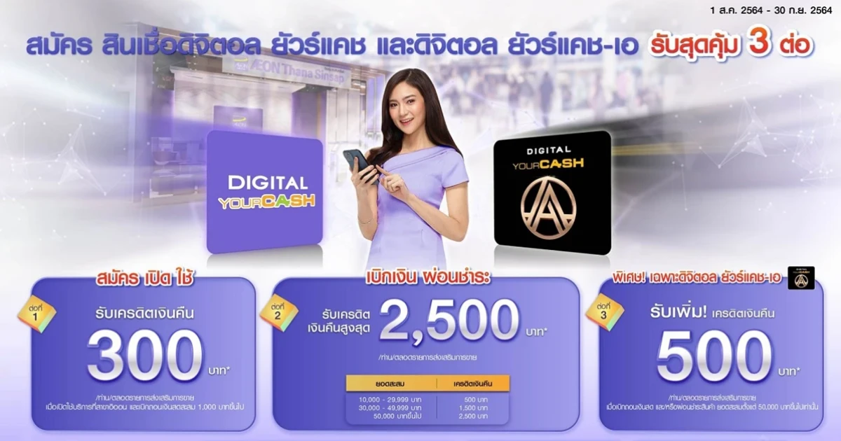 • เมื่อทำการสมัครสินเชื่อดิจิตอลยัวร์แคชหรือสินเชื่อดิจิตอลยัวร์แคชเอ ระหว่างวันที่ 1 สิงหาคม 2564 -30 กันยายน 2564 และเปิดใช้บริการสินเชื่อดิจิตอลยัวร์แคชบนแอปพลิเคชัน AEON THAI MOBILE ที่สาขาอิออน รับเครดิตเงินคืน ดังนี้
