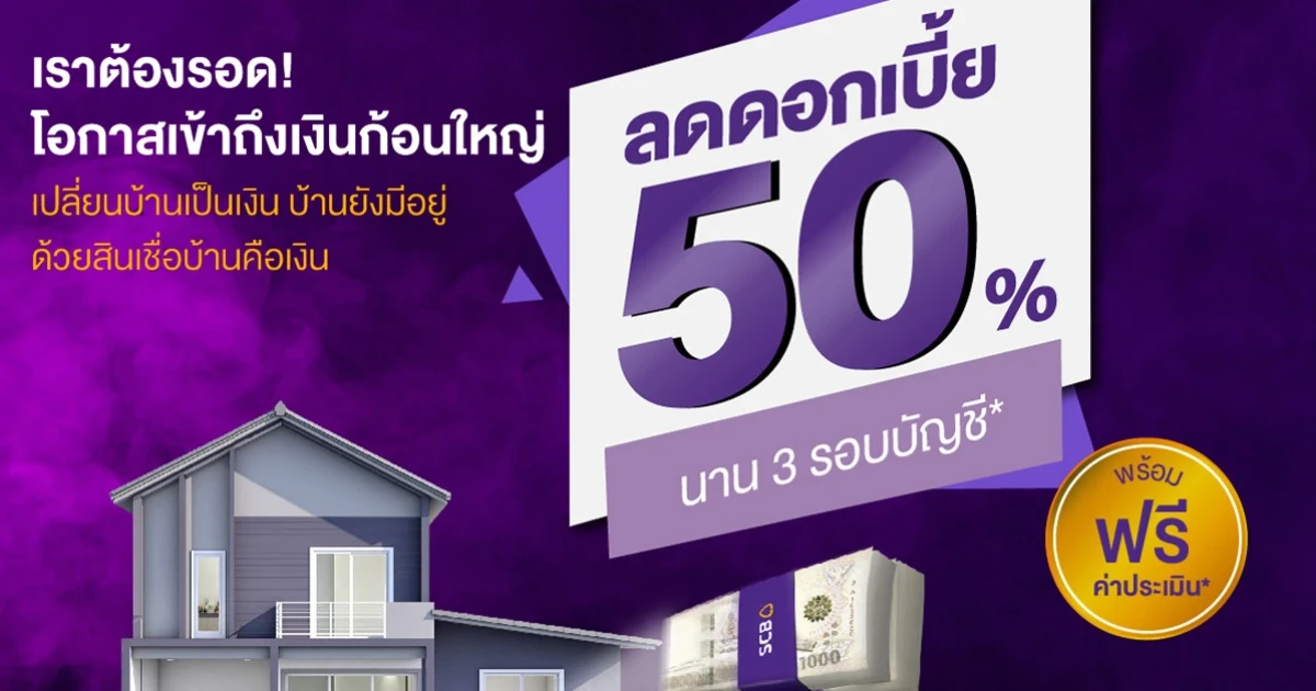 สินเชื่อ SCB แค่มีบ้าน เปลี่ยนเป็นเงินก้อนได้ ลดดอกเบี้ย 50% นาน 3 รอบบัญชี วันนี้ - 30 ก.ย. 64