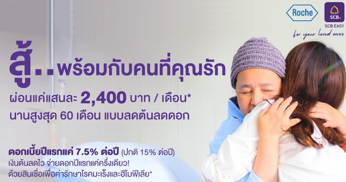 ให้โครงการสินเชื่อเพื่อค่ารักษาโรคมะเร็งและโรคฮีโมฟีเลีย ช่วยแบ่งเบาความกังวลเรื่องค่ารักษาโรคมะเร็งและโรคฮีโมฟีเลียของคนที่คุณรัก พิเศษ! จ่ายดอกเบี้ยแค่ครึ่งเดียวเพียง 7.5% ต่อปี นาน 12 เดือนแรก* ในอัตราลดต้นลดดอก เมื่อเข้าร่วมโครงการ Roche Patient Support Solution (RPSS) และมีเอกสารใบแจ้งค่ายารักษาตามโครงการต่อครั้ง ออกโดยเจ้าหน้าที่ของบริษัท อินดิเพนเดนท์ โพรเซสซิ่ง เซอร์วิสเซส จำกัด (IPS) ตามเงื่อนไขของโครงการ RPSS ณ โรงพยาบาลของรัฐบาลทุกแห่งทั่วประเทศ และโรงพยาบาลเอกชนที่เข้าร่วมโครงการ ซึ่งวงเงินสูงสุดในการสมัครขอสินเชื่อแต่ละครั้งจะไม่เกินค่ายารักษาโรคมะเร็ง หรือยารักษาโรคฮีโมฟีเลีย ต่อสองรอบการรักษาของผู้ป่วย ติดต่อสอบถามข้อมูลสินเชื่อเพิ่มเติมที่ SCB Call Center หรือรายละเอียดโครงการ RPSS กับเจ้าหน้าที่ของบริษัท อินดิเพนเดนท์ โพรเซสซิ่ง เซอร์วิสเซส จำกัด (IPS) โทร 02-161-4948