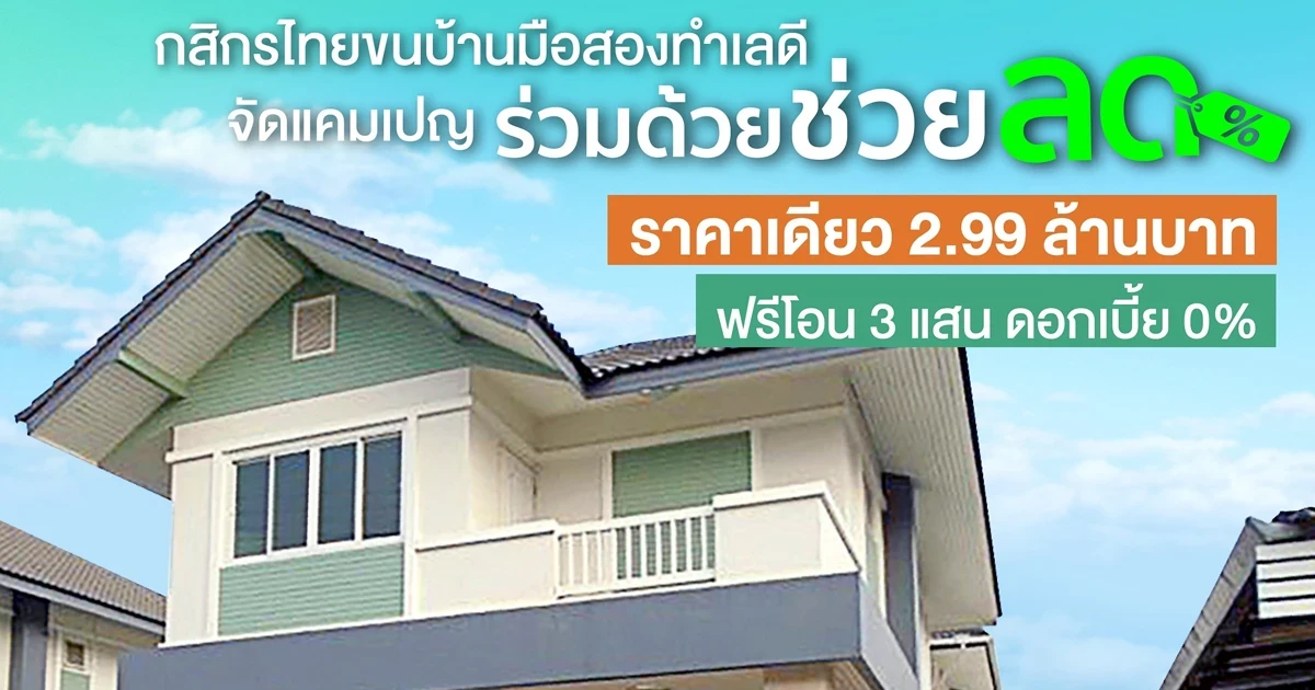 ธนาคารกสิกรไทย จัดเต็มแคมเปญ "ร่วมด้วยช่วยลด" เอาใจคนอยากมีบ้าน ลดราคาบ้านมือสองราคาเดียว 2.99 ล้านบาท และอสังหาริมทรัพย์มือสองอีกมากมาย ที่ให้ส่วนลดสูงสุด 60% พร้อมโปรสุดพิเศษ ฟรีค่าโอนสูงสุด 3 แสนบาท สำหรับลูกค้าที่ต้องการสินเชื่อเพื่อซื้อบ้านมือสองกสิกรไทย ธนาคารมอบอัตราดอกเบี้ยพิเศษ 0% นาน 6 เดือน หวังช่วยลดภาระให้คนอยากมีบ้านและเป็นเจ้าของบ้านได้ง่ายขึ้น ร่วมแคมเปญพิเศษและเลือกสรรบ้านมือสองแบบ คัด คุ้ม ครบ ได้ง่ายๆ บนเว็บไซต์ธนาคารกสิกรไทย ตั้งแต่วันที่ 15 ตุลาคม - 30 ธันวาคม 2564